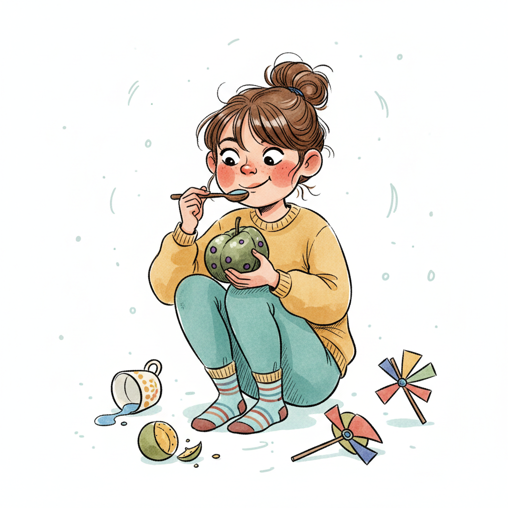 Fröhliches Mädchen isst genüsslich Obst mit Löffel, umgeben von Spielzeug und kleiner Unordnung.