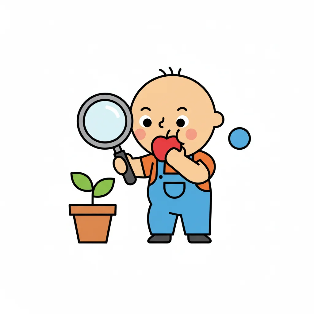 Kleinkind mit Lupe betrachtet Pflanze, isst Apfel. Neugier und gesunde Ernährung.
