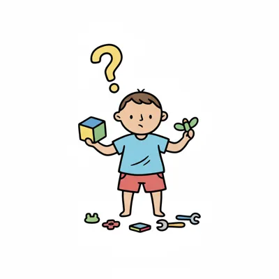 Ein verwirrtes Kind mit Spielzeugteilen und einem Fragezeichen über dem Kopf.