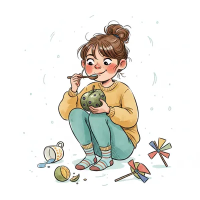 Niedliche, kindgerecht illustrierte Szene mit einem Kind oder einer Person als Hauptfigur, vor rein weißem Hintergrund, im frech-nordischen Aquarell-Skizzenstil. Klare, leicht wackelige Tuschekonturen, sichtbare Pinsel- und Strichtextur, dezente Schraffuren, weiche handgemalte Farbflächen in gedeckten Farben. Einfache, runde Formen. Keine harten Schatten, sondern sanfte, transparente Aquarellschichten. Leicht raue, handgezeichnete Linien statt glatter Vektorkanten. Subtile, vereinzelte Kritzelpunkte oder kleine Details im Hintergrund (wie Pünktchen oder feine Striche), aber keine echte Umgebung oder Landschaft. Die Figur ist mittig zentriert. Insgesamt charmant, humorvoll, warm und handgemacht wirkend. WICHTIG: Das Bild darf ABSOLUT KEINEN TEXT, KEINE BUCHSTABEN und KEINE ZAHLEN enthalten.