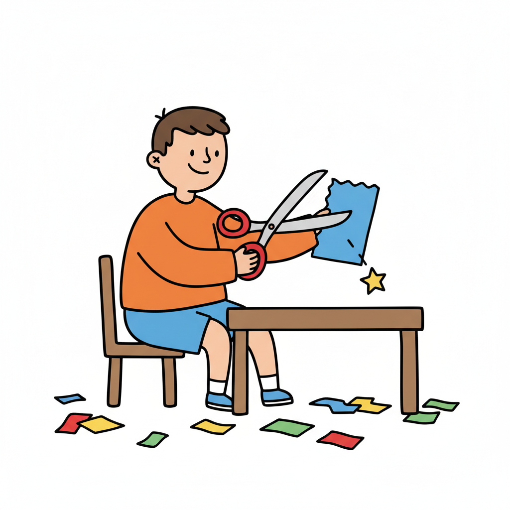 Ein Kind schneidet Papier mit einer Schere und lässt Formen fallen.