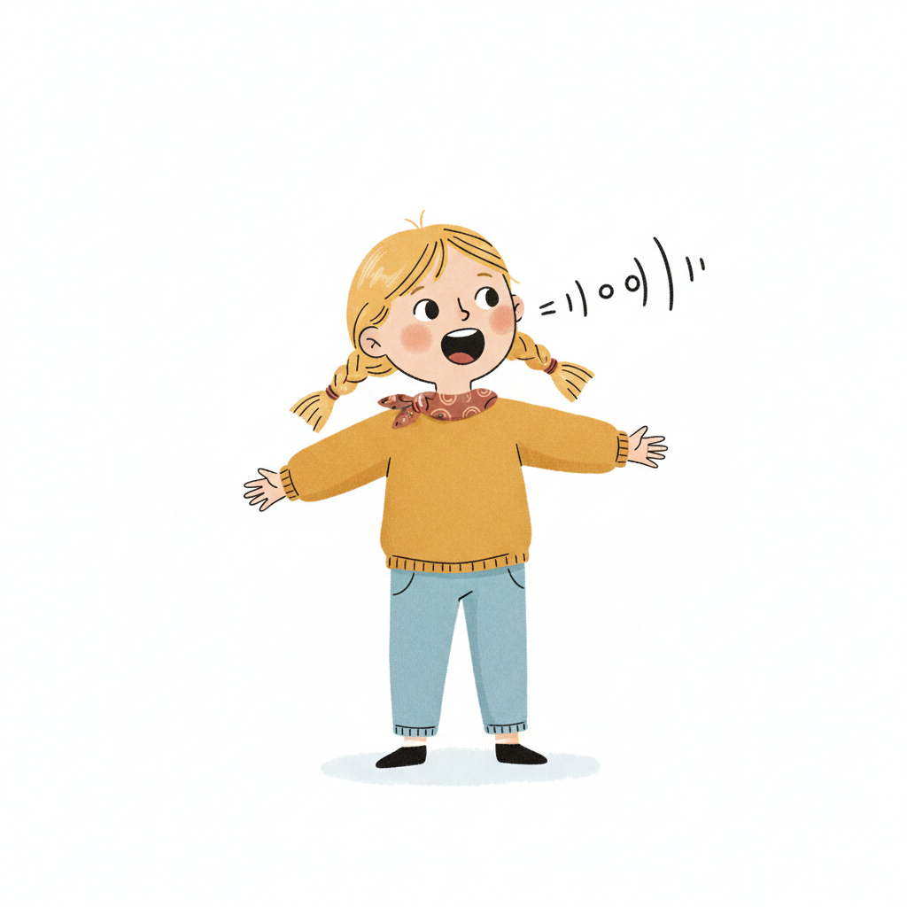 Blondes Cartoon-Mädchen mit Zöpfen spricht oder singt, mit Sprechsymbolen und offenen Armen.