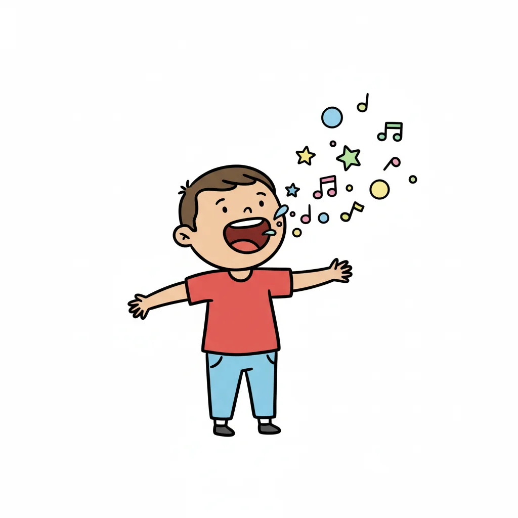 Ein Cartoon-Junge singt, Noten, Sterne und Kreise kommen aus seinem Mund.