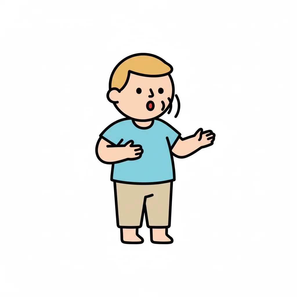 Blonder Cartoon-Junge spricht oder singt, eine Hand auf der Brust, die andere gestikulierend.