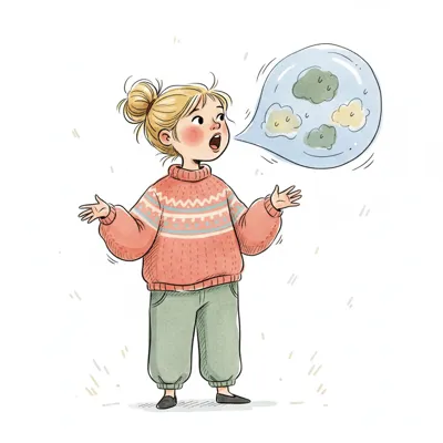 Blondes Mädchen in rosa Pullover spricht mit geöffnetem Mund, Wolken in der Sprechblase.