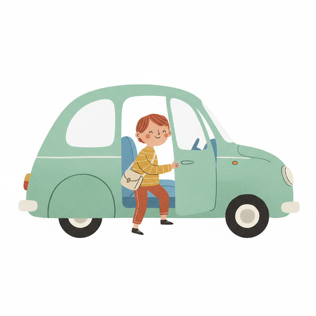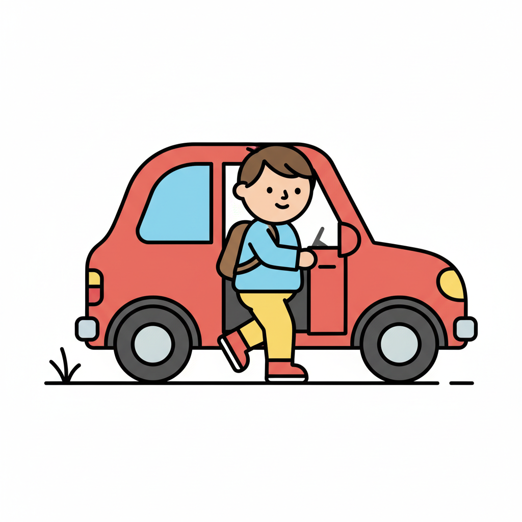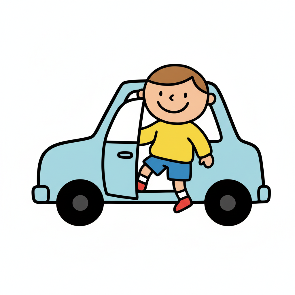 Ein lächelnder Cartoon-Junge steigt in ein hellblaues Auto ein.