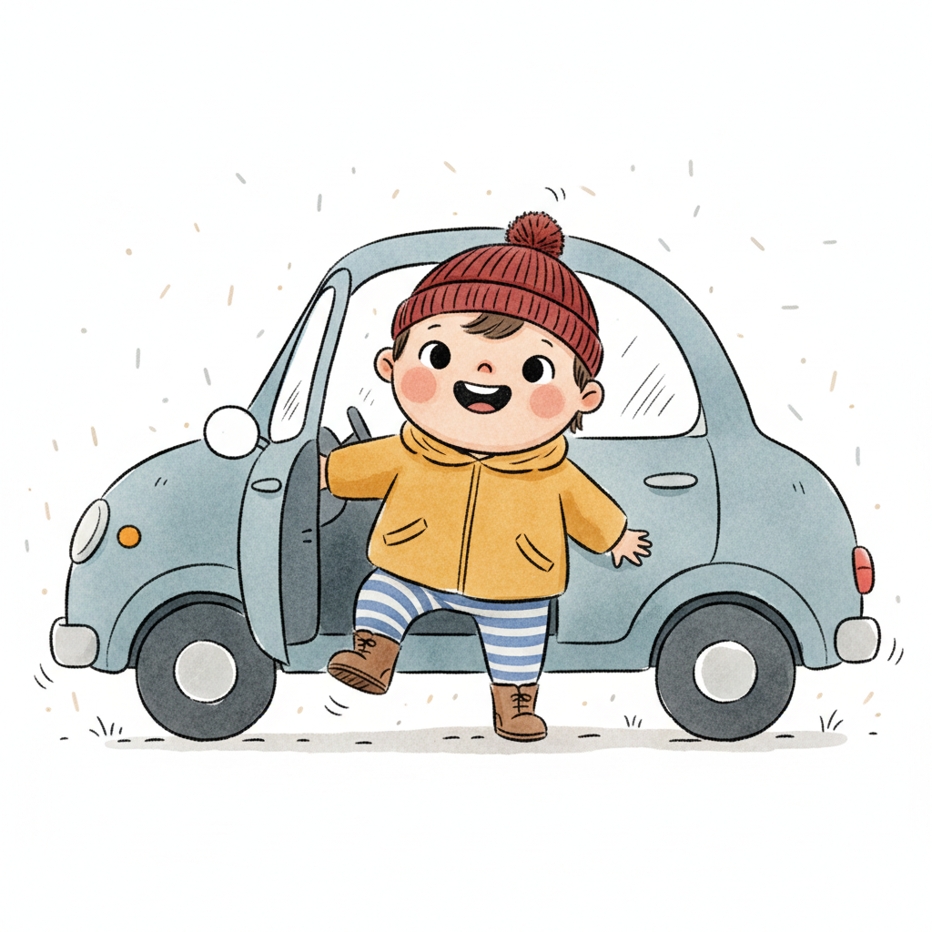 Fröhliches Cartoon-Kind mit Mütze und Jacke steigt in ein kleines blaues Auto ein.