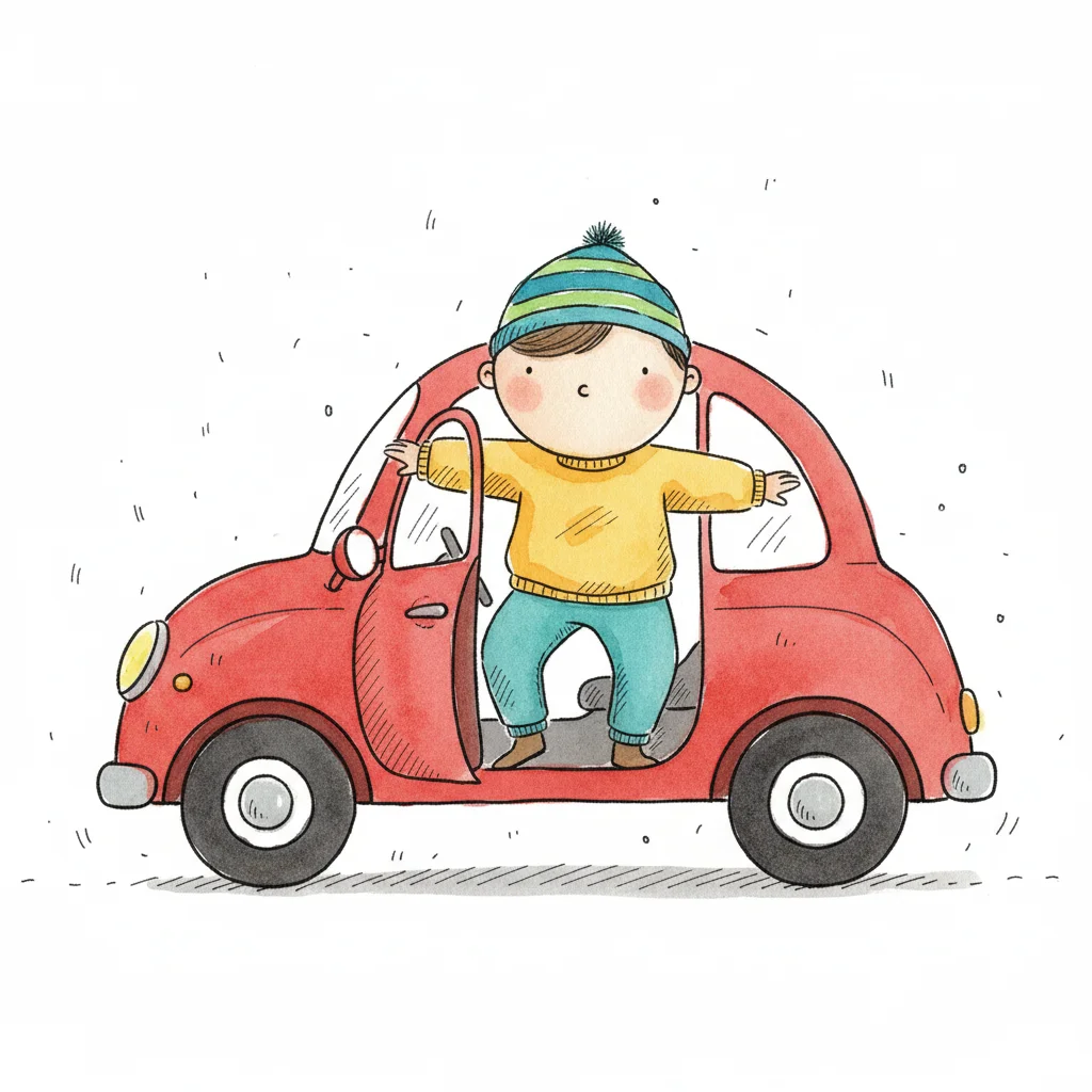 Niedliche Illustration eines Jungen mit Mütze, der in einem roten Auto mit offenen Türen steht.