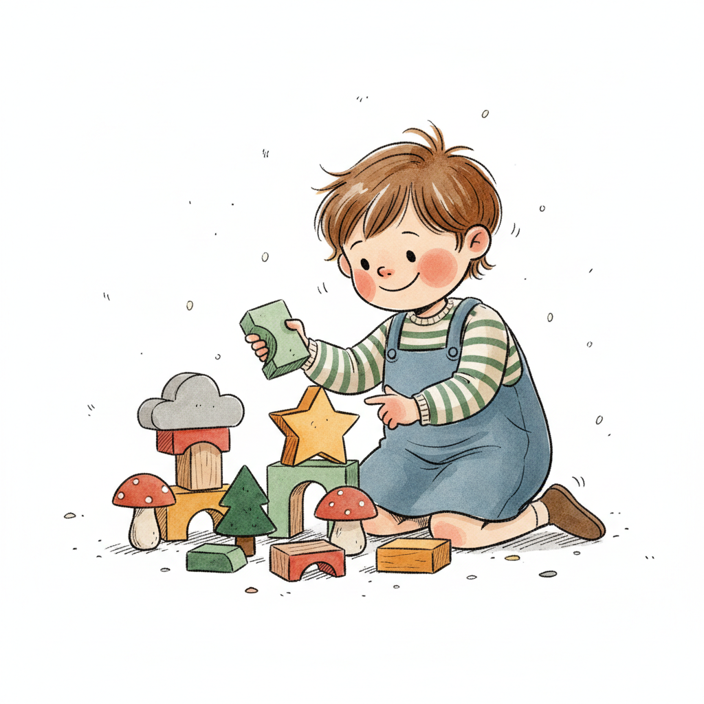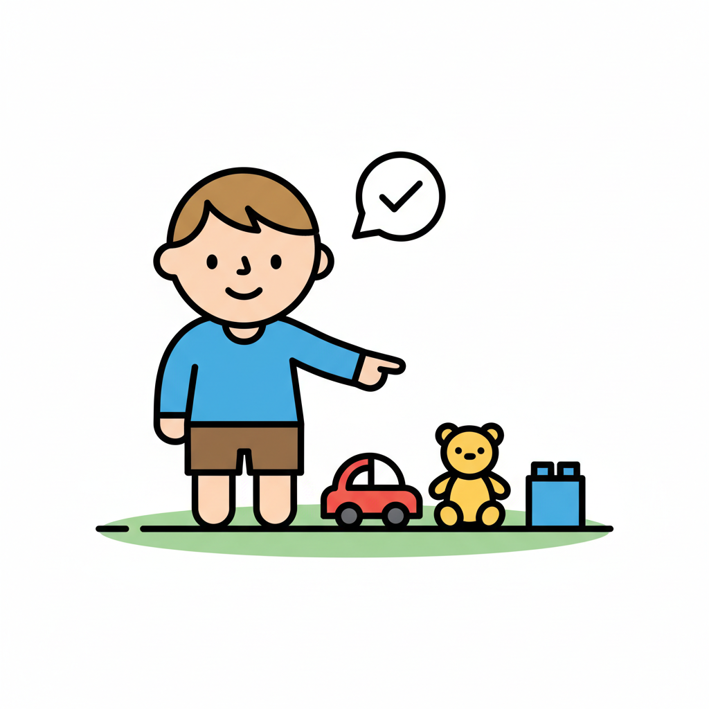 Junge zeigt auf Spielzeug (Auto, Teddy, Baustein) mit Häkchen, symbolisiert Auswahl oder Zustimmung.