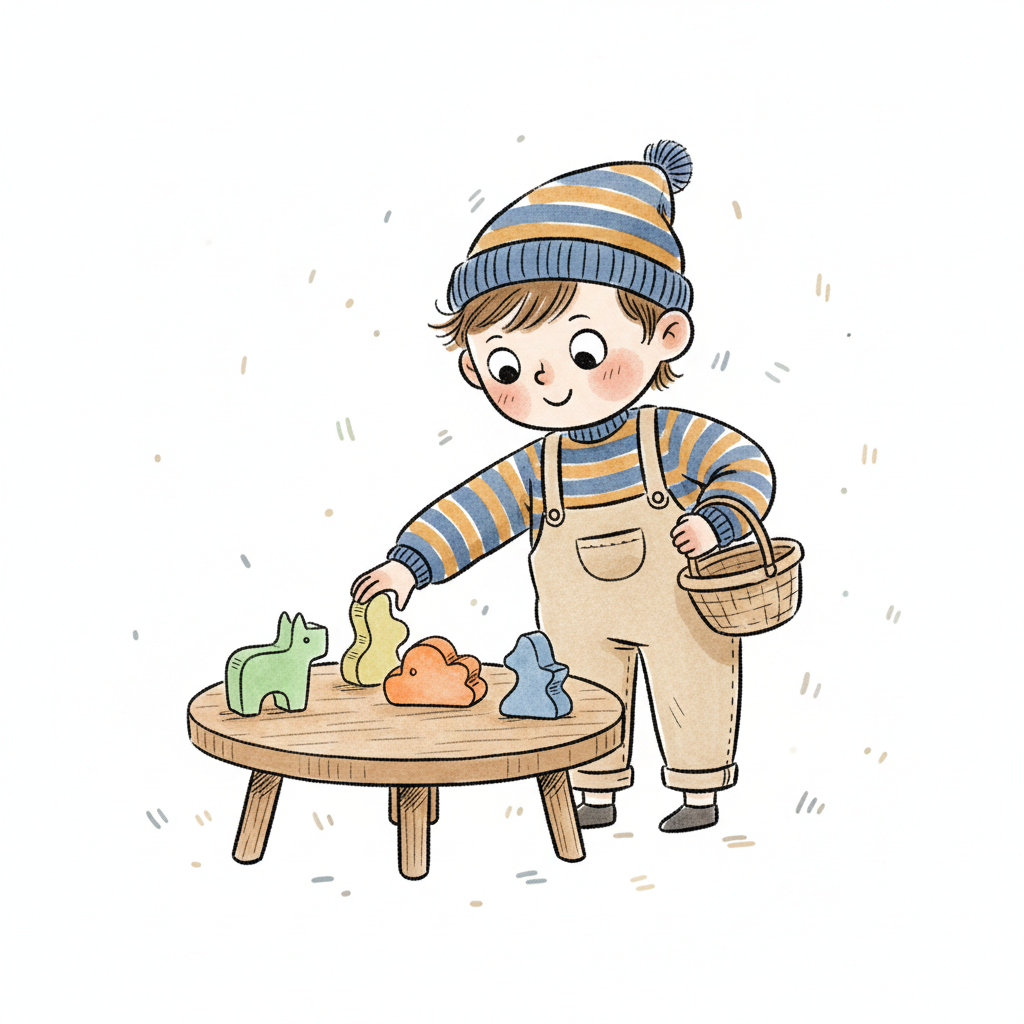 Fröhliches Kind in Mütze und Latzhose spielt mit bunten Holzfiguren auf kleinem Tisch.