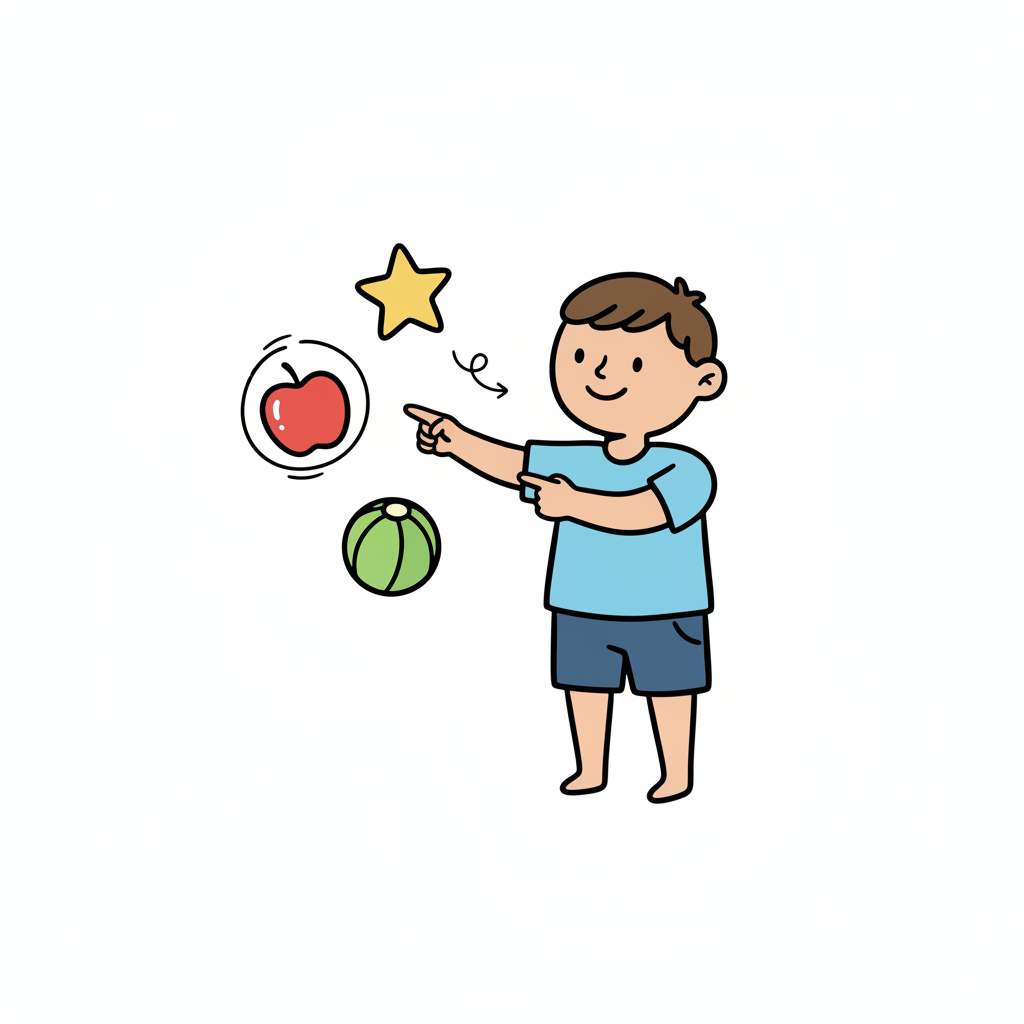 Ein Cartoon-Junge zeigt auf Apfel, Stern und Ball, symbolisiert Auswahl oder Lernen.