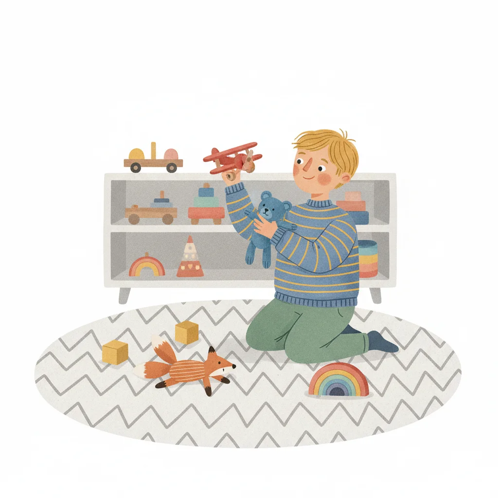 Junge spielt auf einem Teppich mit Flugzeug und Teddybär, umgeben von Holzspielzeug.