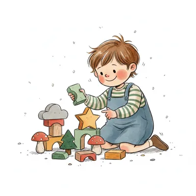 Ein lächelndes Kind spielt mit bunten Holzbausteinen in verschiedenen Formen.