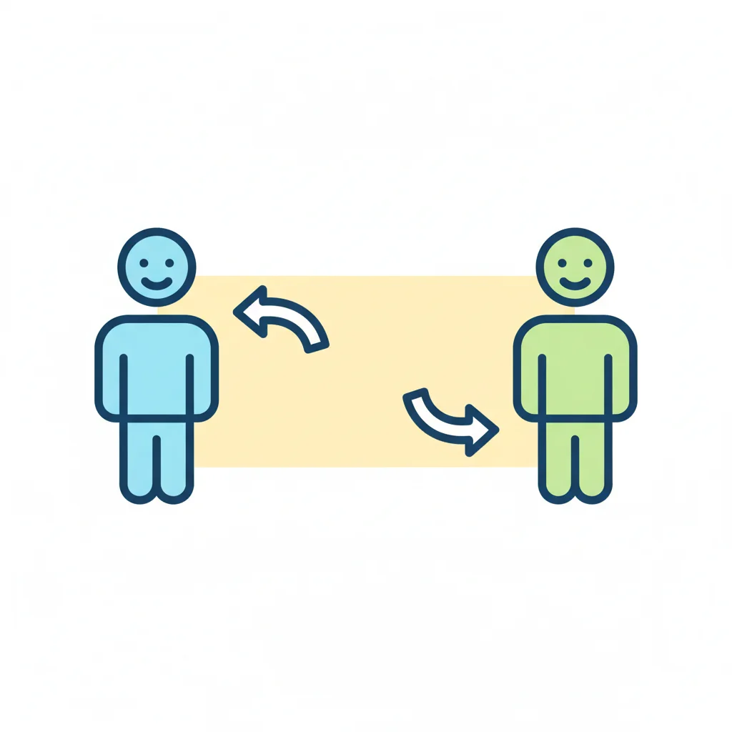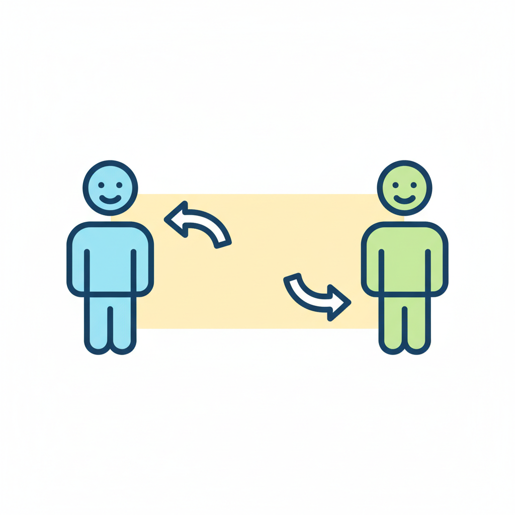 Zwei lächelnde Figuren interagieren mit Händen und Pfeilen, die Austausch oder Distanz darstellen.