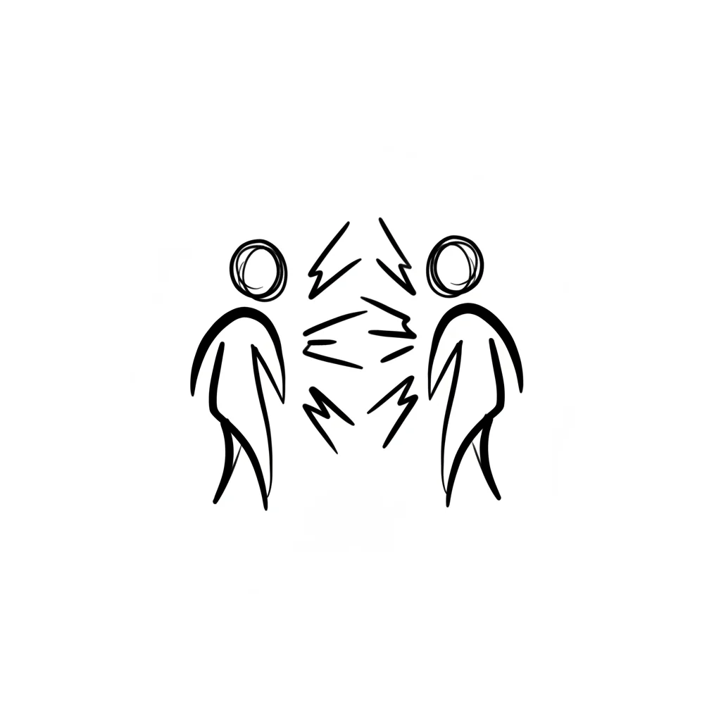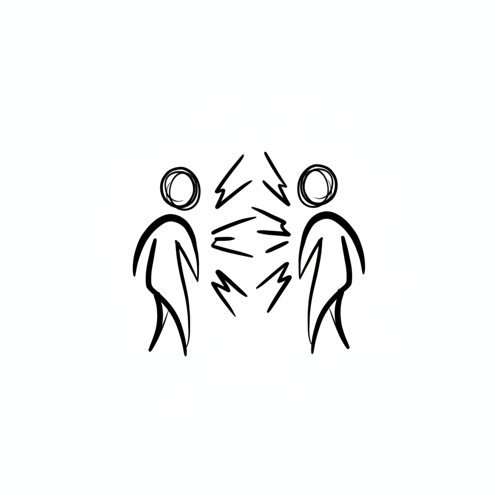 Zwei Strichmännchen im intensiven Austausch, möglicherweise Konflikt, mit Blitzen/Wellen.