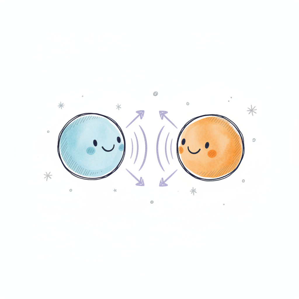 Zwei lächelnde Kreise kommunizieren mit Wellen und Pfeilen, symbolisierend Austausch und Interaktion.