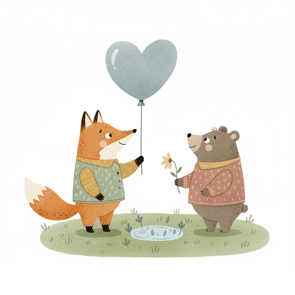 Niedliche Illustration von Fuchs und Bär, die Geschenke austauschen: Herzballon und Blume.