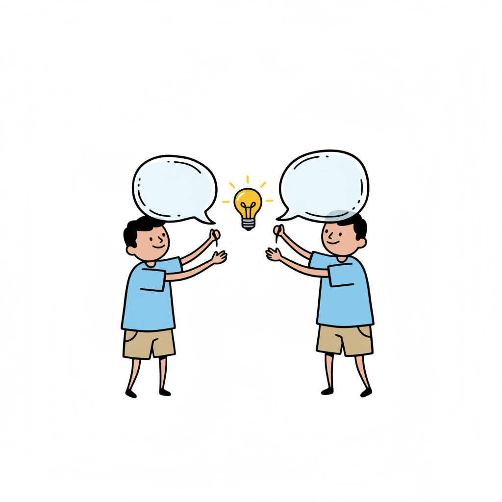 Zwei Cartoon-Figuren tauschen Ideen aus, dargestellt durch Sprechblasen und eine leuchtende Glühbirne.