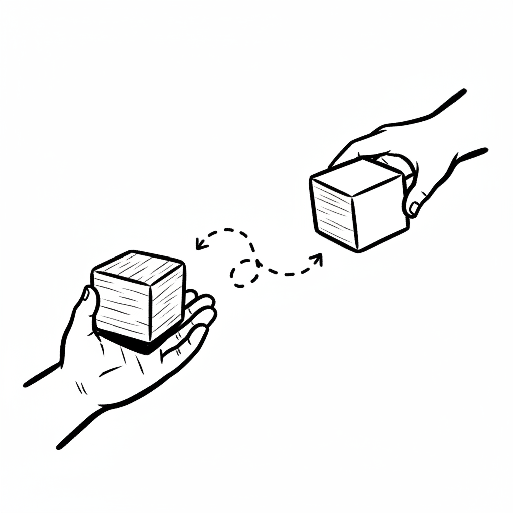 Austausch von Blöcken zwischen zwei Händen, dargestellt durch gestrichelte Pfeile.