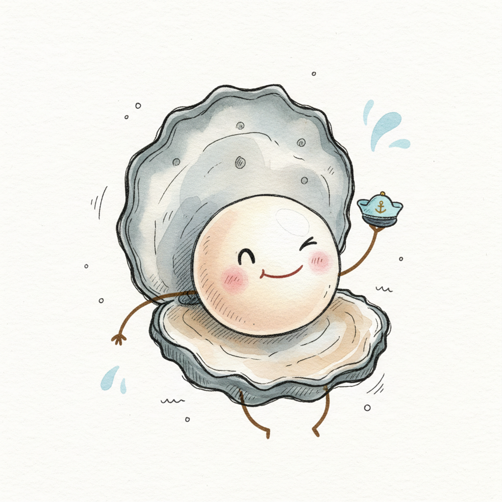 Eine fröhliche Muschel mit einer Perle, die ein kleines Boot hält.