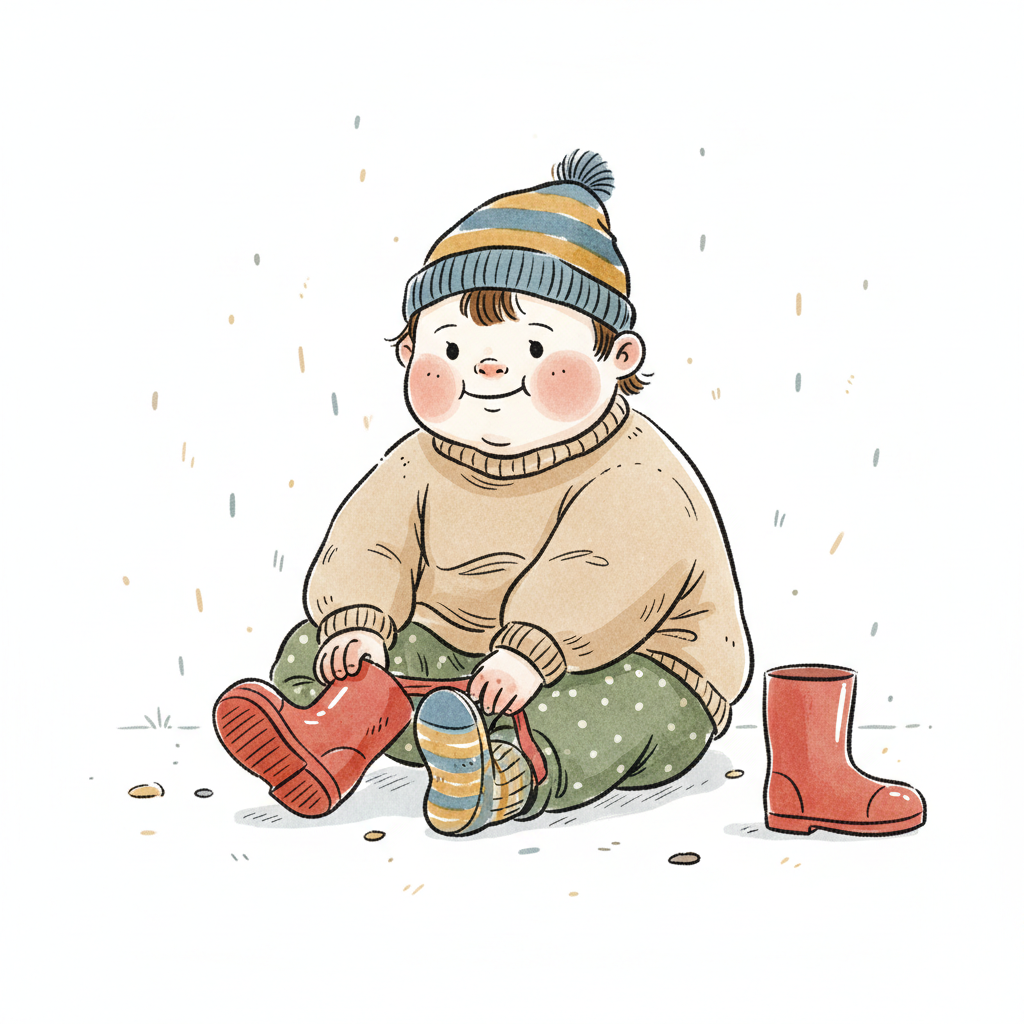Handgezeichnete Kinderbuchillustration im modernen skandinavisch-nordischen Stil. Minimalistische, freundliche Figur mit einfachen Formen und leicht unregelmäßigen, handgezeichneten Linien. Ruhige, gedeckte Farbpalette, viel freie Fläche, reduzierte Details, sanfte Papier- oder Aquarellstruktur. Warme, ruhige, leicht humorvolle Stimmung, flächige Komposition ohne starke Perspektive, moderner nordischer Illustrationsstil, charmant und zeitlos.