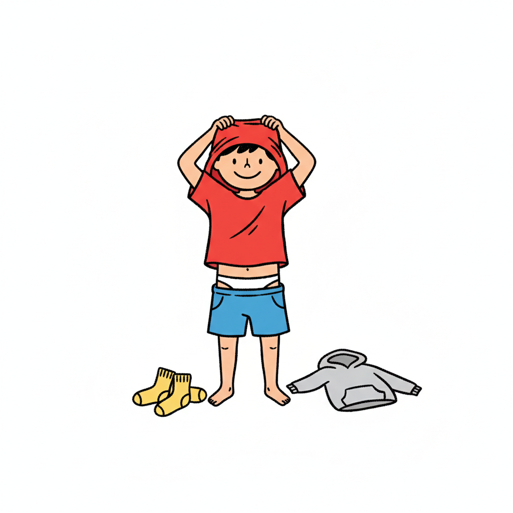 Ein lächelnder Cartoon-Junge zieht sich ein rotes T-Shirt an. Socken und Hoodie liegen daneben.