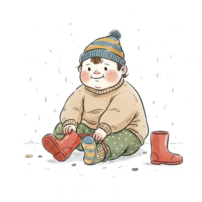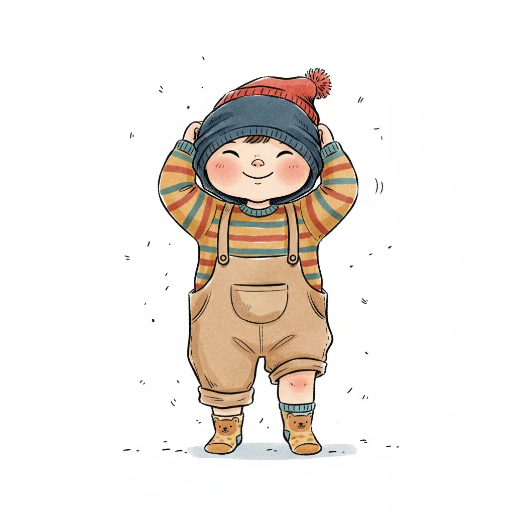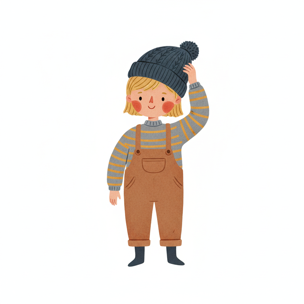 Niedliche Illustration eines Kindes in Latzhose und Strickmütze, die es am Kopf hält.