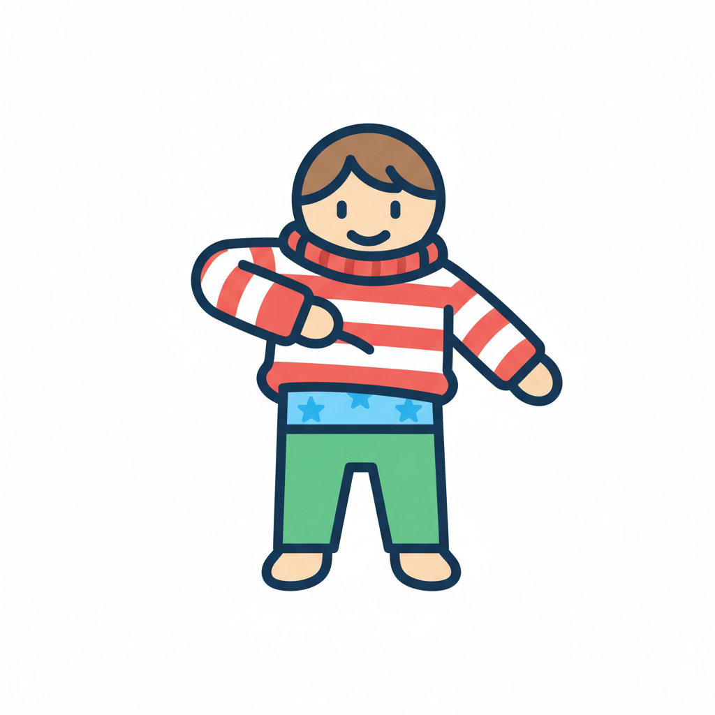 Lachende Cartoonfigur in gestreiftem Pullover und grüner Hose, die einen Wunderkerze hält.