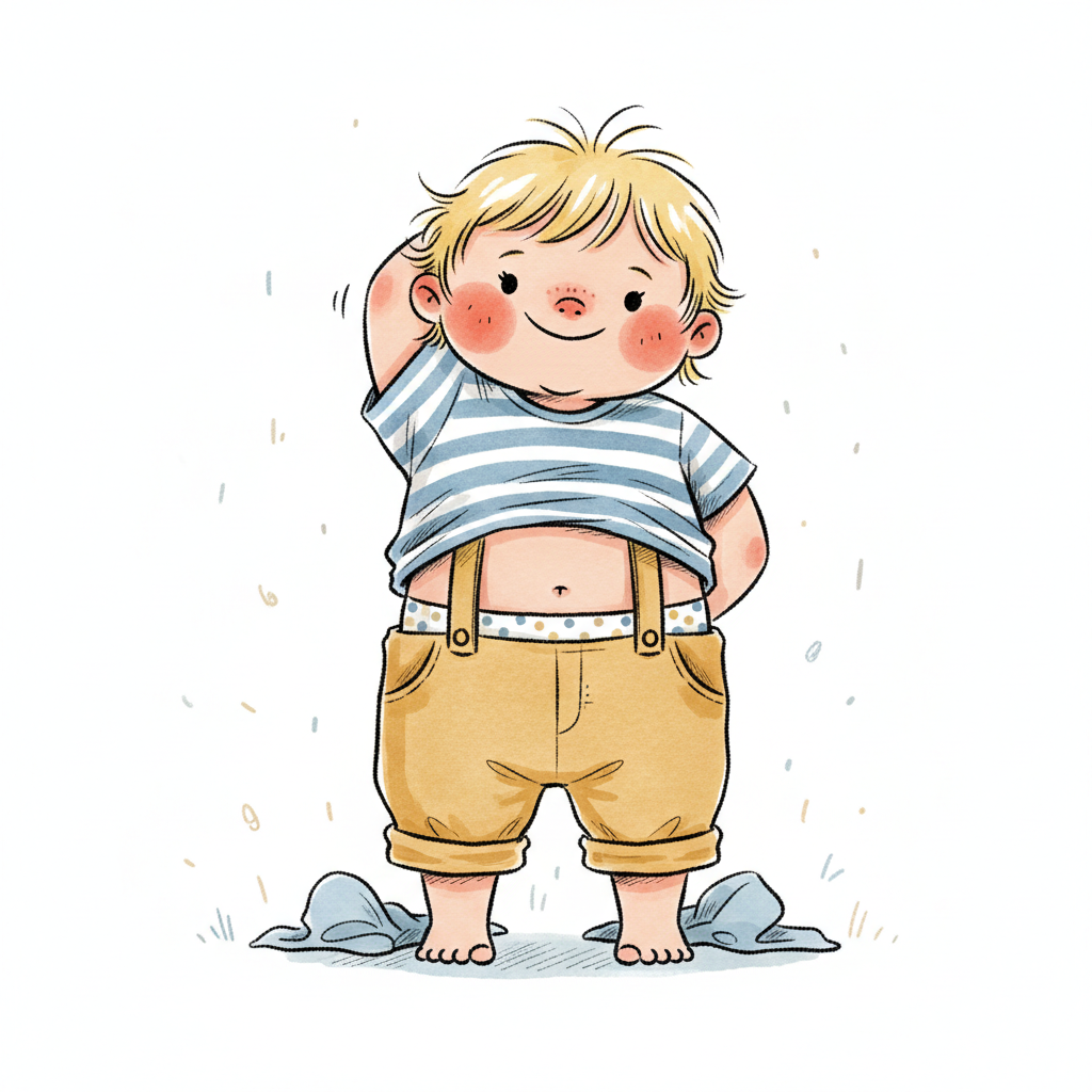 Niedliche, kindgerecht illustrierte Szene mit einem Kind oder einer Person als Hauptfigur, vor rein weißem Hintergrund, im frech-nordischen Aquarell-Skizzenstil. Klare, leicht wackelige Tuschekonturen, sichtbare Pinsel- und Strichtextur, dezente Schraffuren, weiche handgemalte Farbflächen in gedeckten Farben. Einfache, runde Formen. Keine harten Schatten, sondern sanfte, transparente Aquarellschichten. Leicht raue, handgezeichnete Linien statt glatter Vektorkanten. Subtile, vereinzelte Kritzelpunkte oder kleine Details im Hintergrund (wie Pünktchen oder feine Striche), aber keine echte Umgebung oder Landschaft. Die Figur ist mittig zentriert. Insgesamt charmant, humorvoll, warm und handgemacht wirkend. WICHTIG: Das Bild darf ABSOLUT KEINEN TEXT, KEINE BUCHSTABEN und KEINE ZAHLEN enthalten.