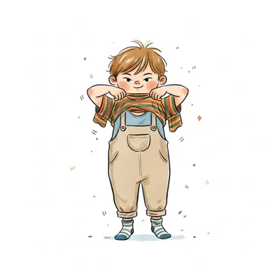 Niedlicher Cartoon-Junge in Latzhose zieht sich sein gestreiftes T-Shirt an.