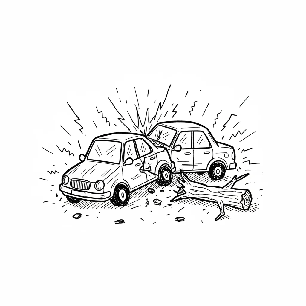 Schwarz-weiß-Skizze eines Autounfalls mit zwei kollidierenden Fahrzeugen und einem Baumstamm.