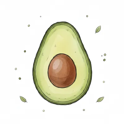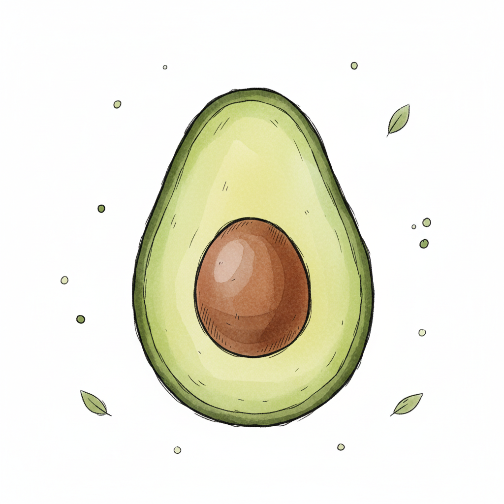 Illustration einer Avocado mit Kern, umgeben von kleinen Blättern.