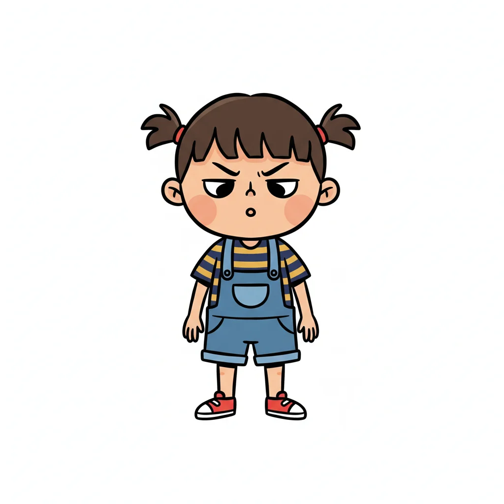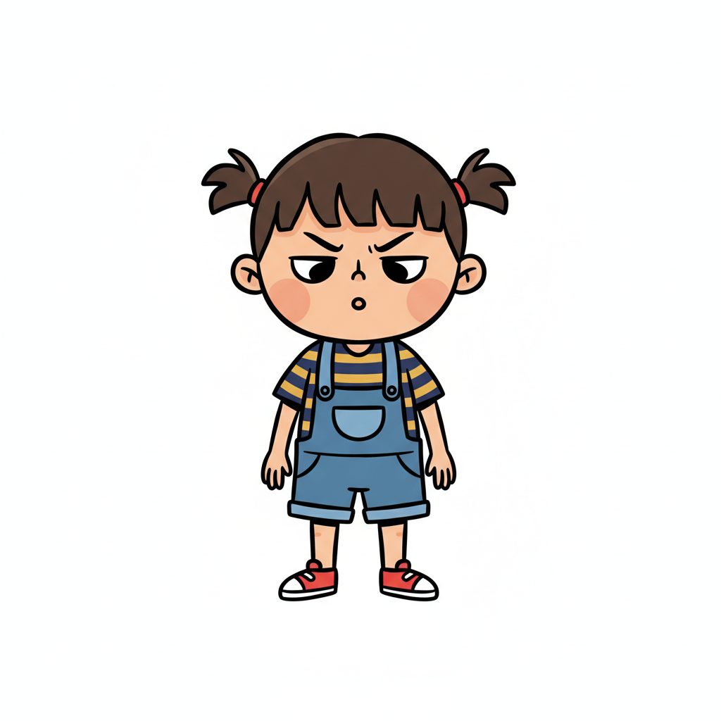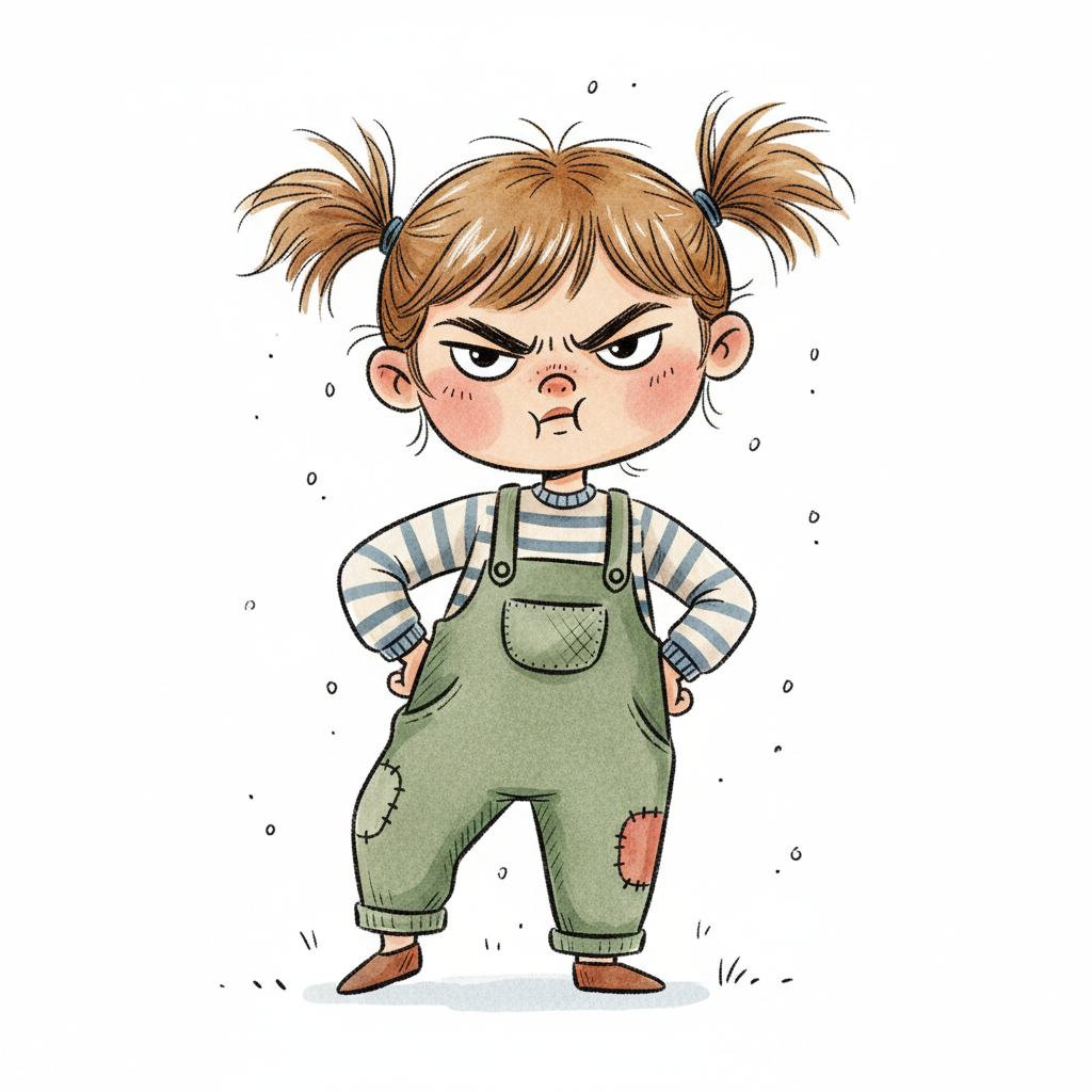 Ein mürrisches Mädchen mit Zöpfen und Latzhose schaut wütend.