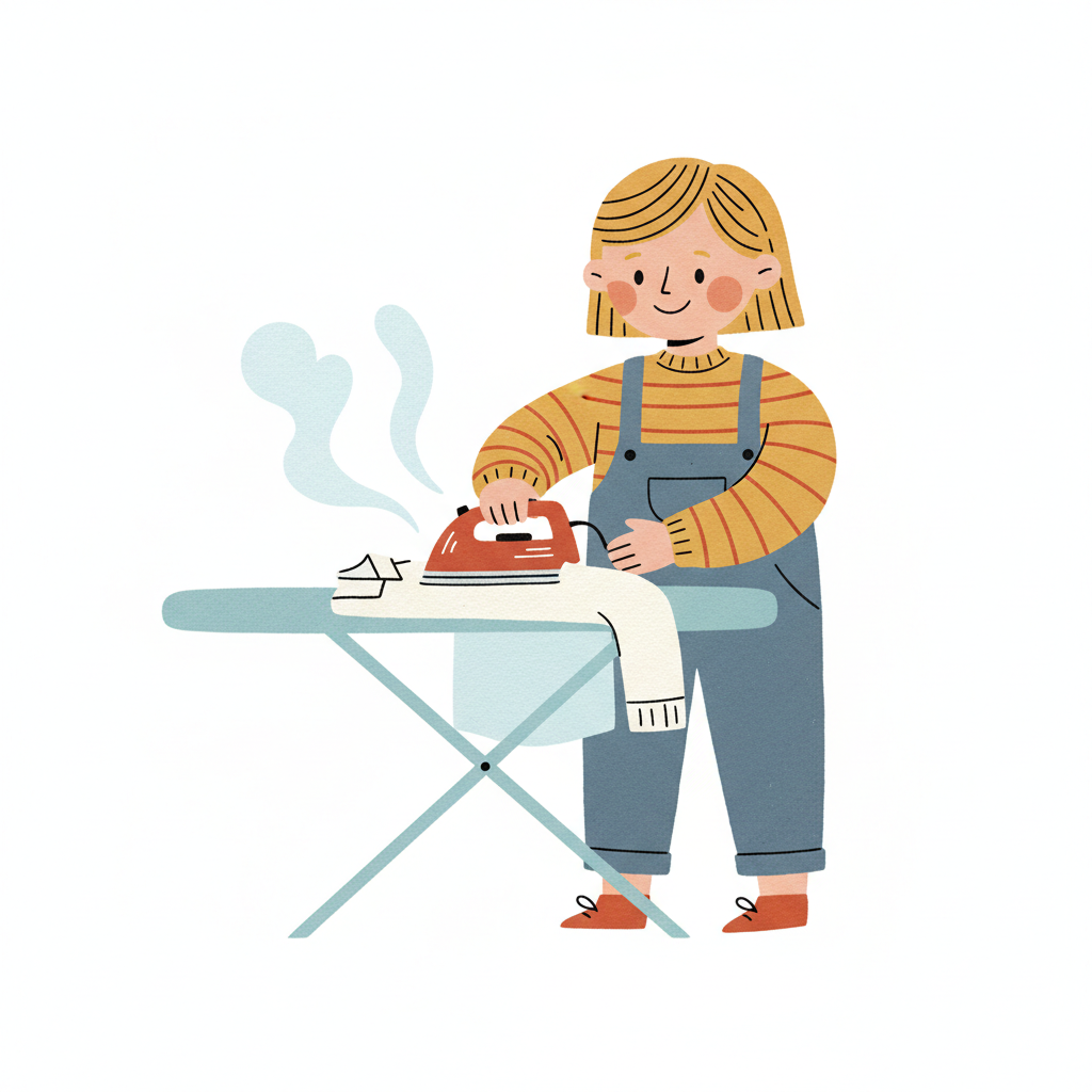 Eine lächelnde Person bügelt Kleidung auf einem Bügelbrett, Dampf steigt auf. Cartoon-Stil.