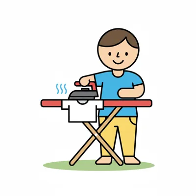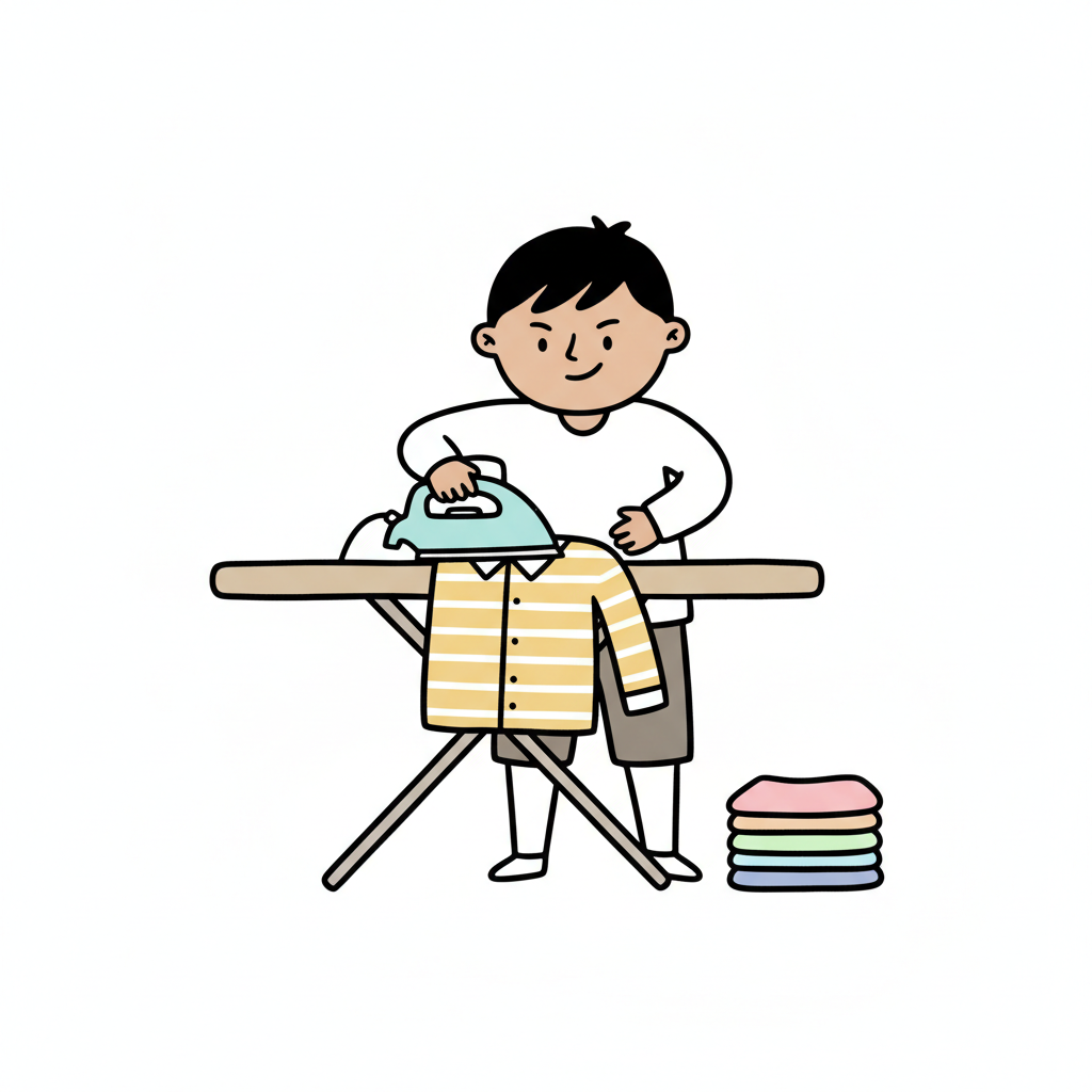 Cartoon-Kind bügelt ein T-Shirt auf einem Bügelbrett, daneben liegen gefaltete Kleidung.
