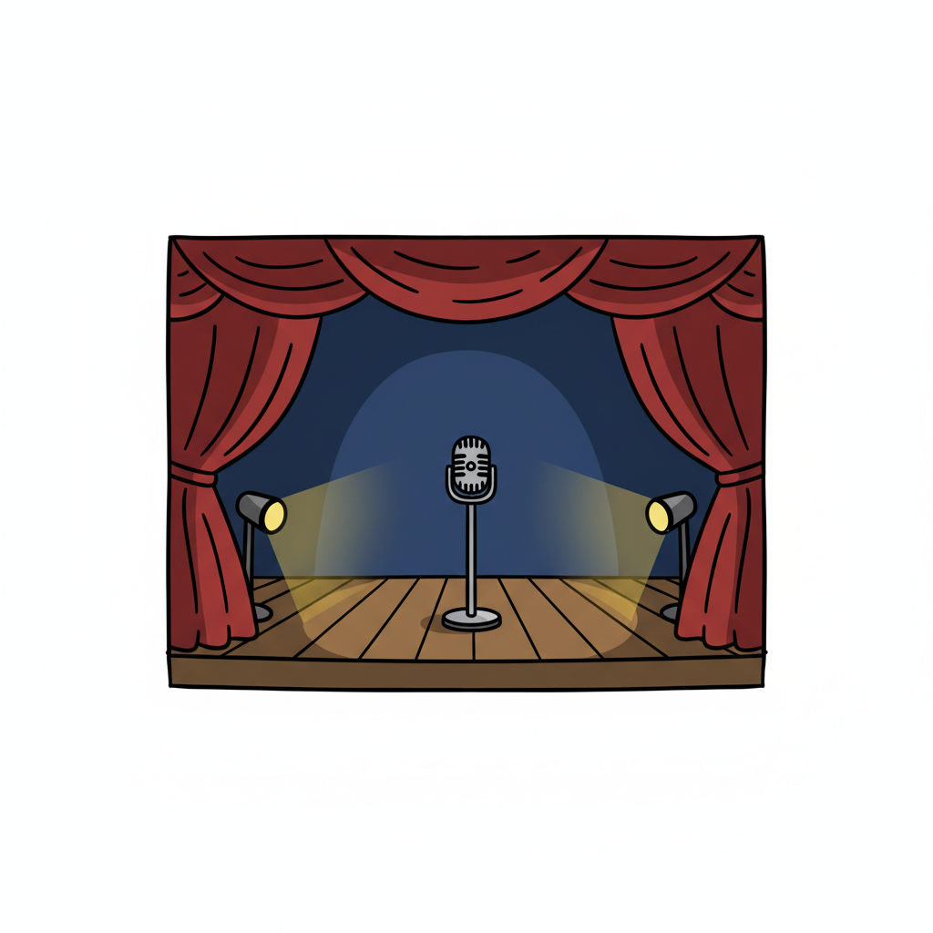 Leere Cartoon-Bühne mit roten Vorhängen, Mikrofon und Scheinwerfern, bereit für eine Show.