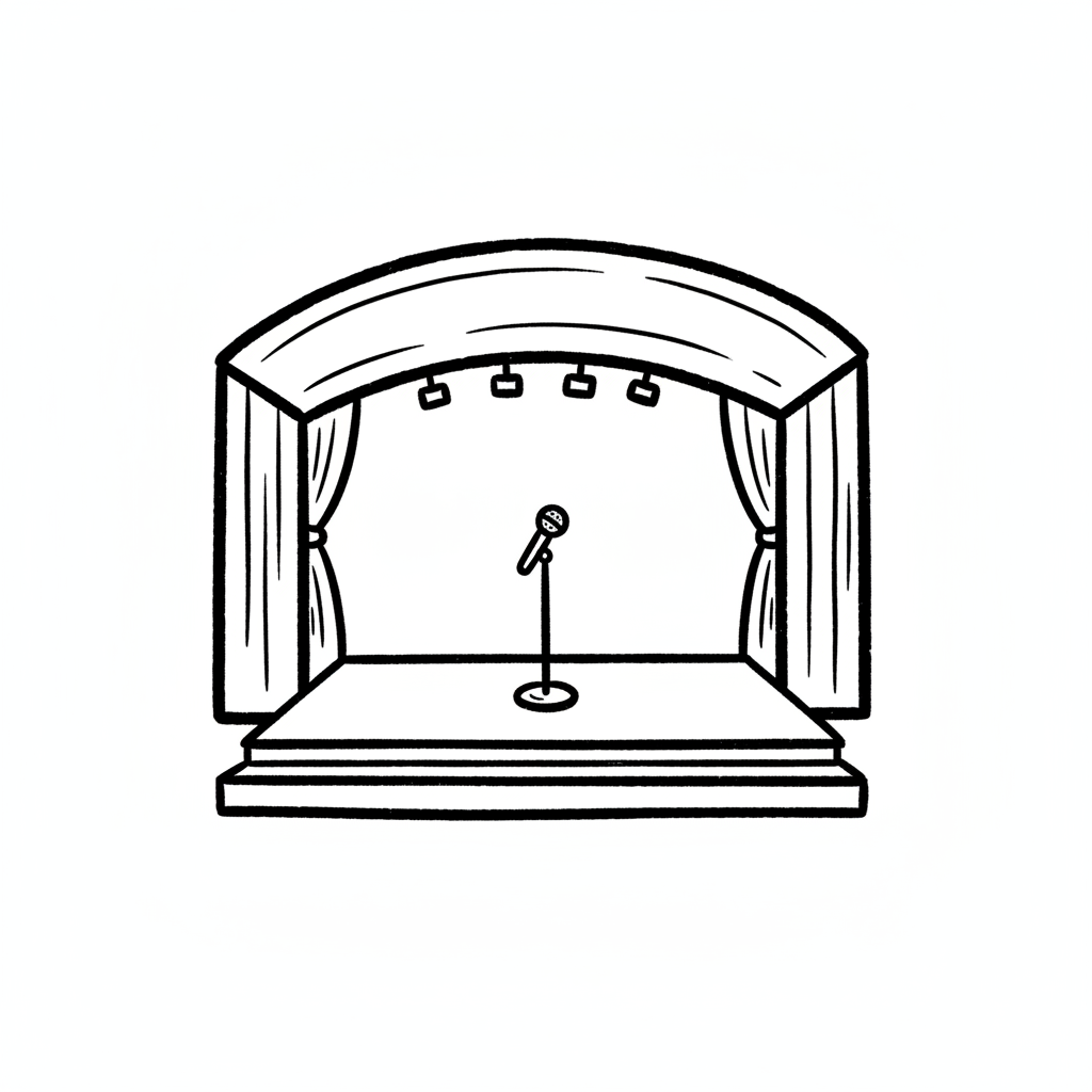 Schwarz-weiße Skizze einer leeren Bühne mit Mikrofon, Vorhängen und Scheinwerfern.