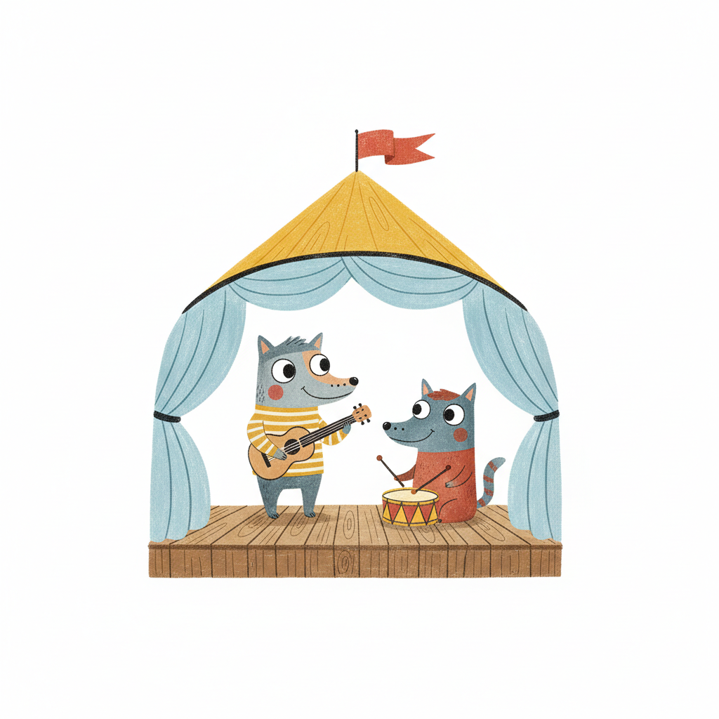 Zwei niedliche Cartoon-Wölfe spielen Gitarre und Trommel auf einer kleinen Bühne unter einem Zelt.