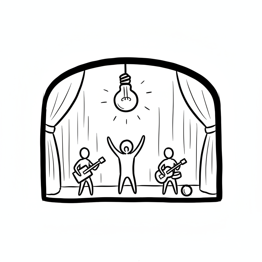 Strichmännchen-Band spielt auf einer Bühne unter einer Glühbirne.