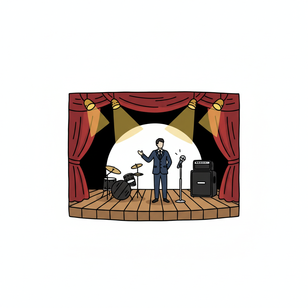 Cartoon eines Mannes im Anzug auf einer Bühne mit Mikrofon, Schlagzeug und Scheinwerfern.