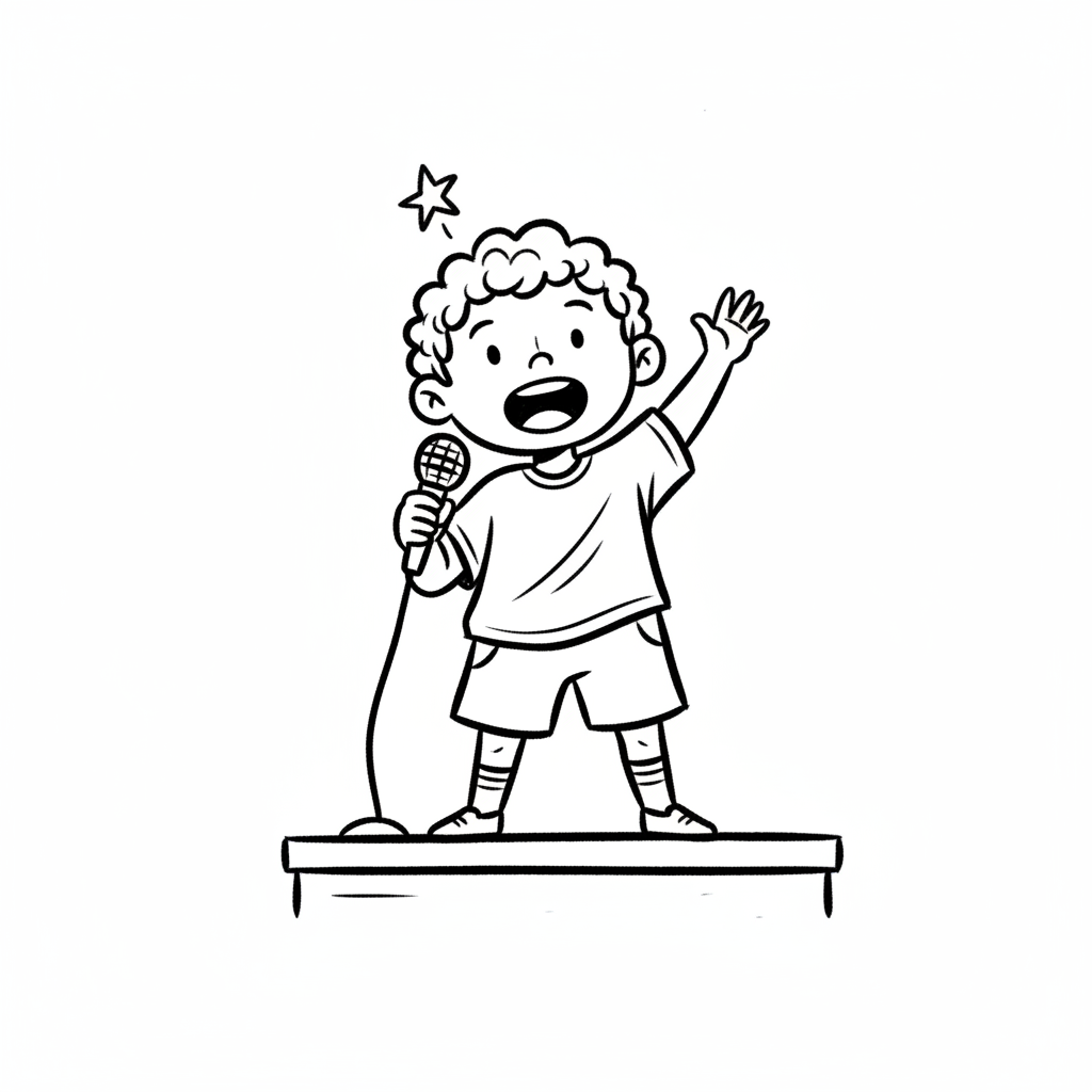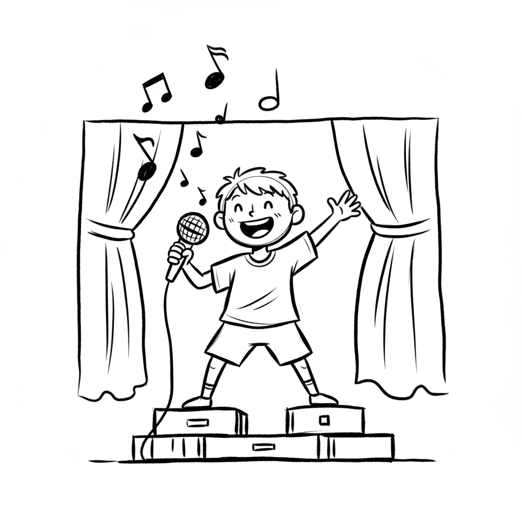 Schwarz-Weiß-Zeichnung eines singenden Jungen mit Mikrofon auf einer Bühne, Stern über dem Kopf.