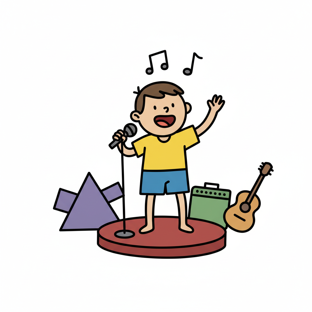 Glücklicher Cartoon-Junge singt auf einer Bühne ins Mikrofon, umgeben von Musikinstrumenten.