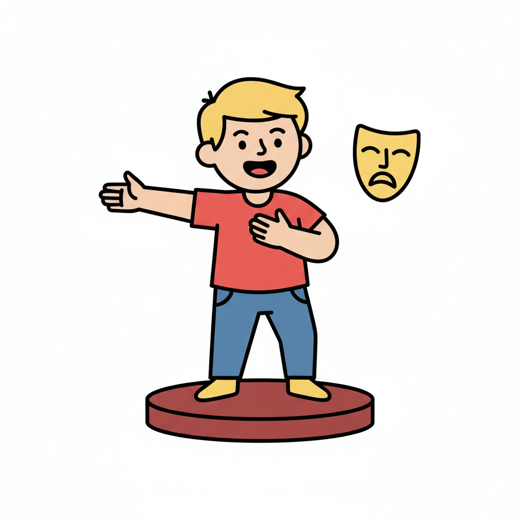 Junge auf Bühne mit trauriger Maske, stellt Emotionen dar.