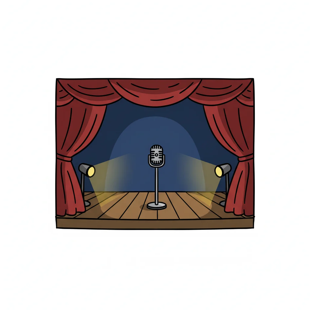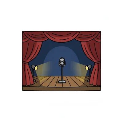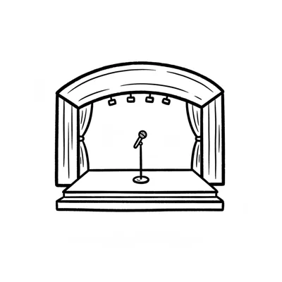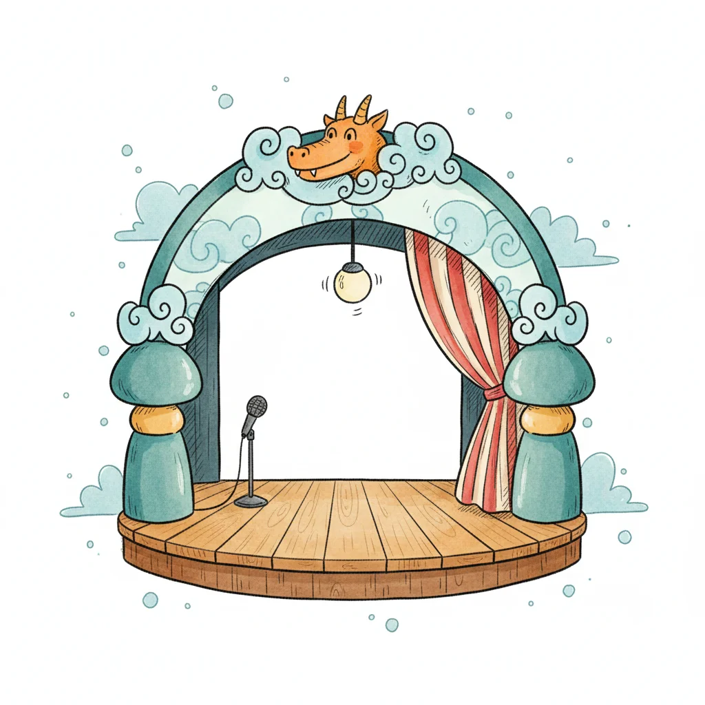 Illustrierte Bühne mit Mikrofon, Drachenkopf-Bogen und gestreiftem Vorhang.