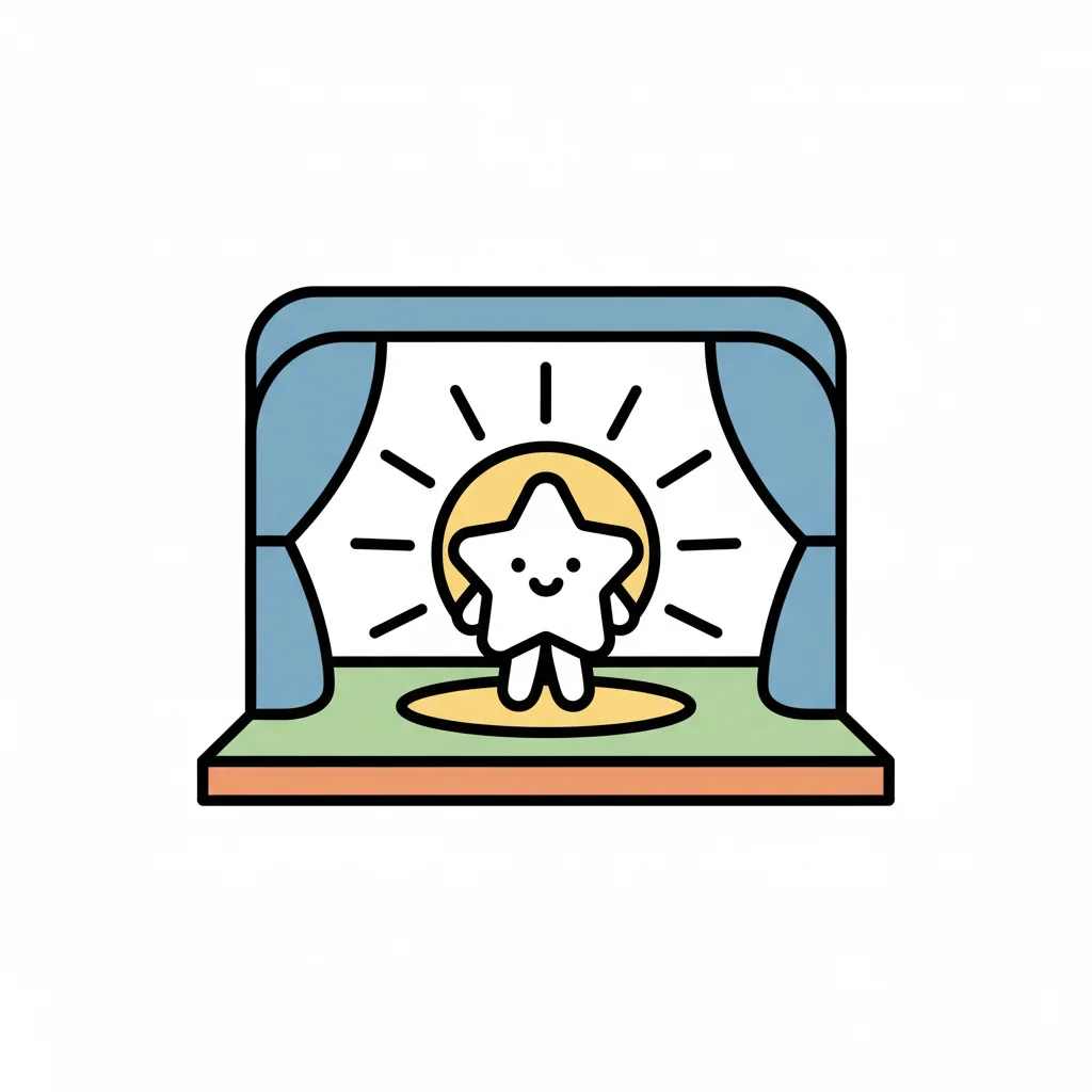 Ein lächelnder Stern steht auf einer Bühne mit blauen Vorhängen und einem strahlenden Hintergrund.