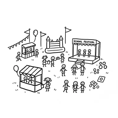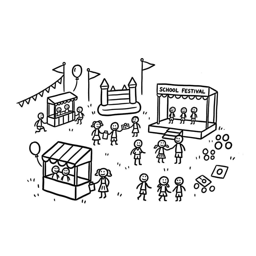 Strichmännchen-Illustration eines lebhaften Schulfestes mit Hüpfburg, Ständen und Bühne.