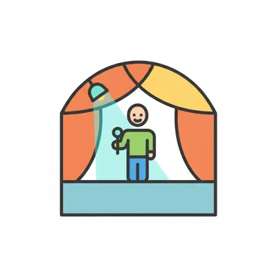 Icon: Eine lächelnde Person steht mit Mikrofon auf einer Bühne im Scheinwerferlicht.