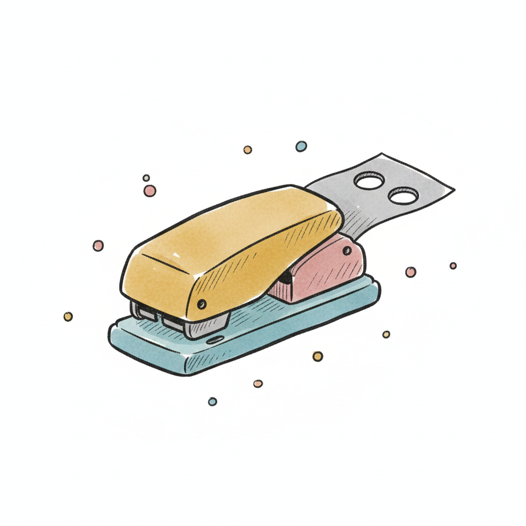 Ein bunter Tacker auf einem Tisch, umgeben von kleinen Punkten.