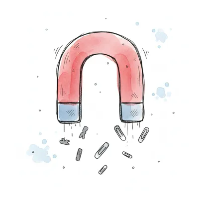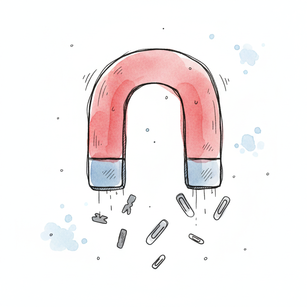 Ein bunter Magnet zieht verschiedene Büroklammern an.