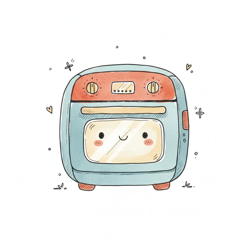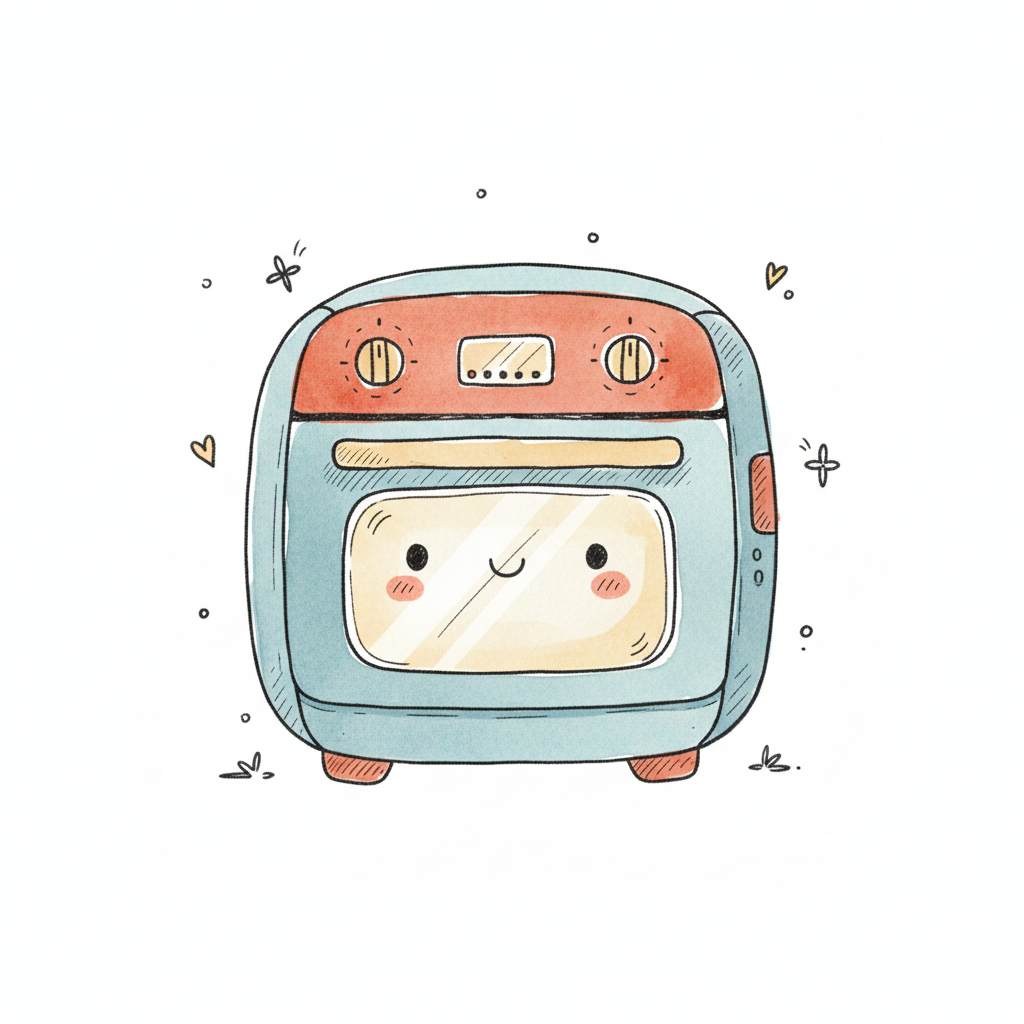 Ein niedlicher, lächelnder Ofen mit buntem Design und Kawaii-Stil.
